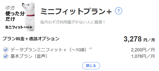 選択したのは最安の「ミニフィットプラン+」で、1GB以上使用すると料金が段階的に上がっていくプランです。1GBしか使えないくせに3,278円もするのは高すぎです。