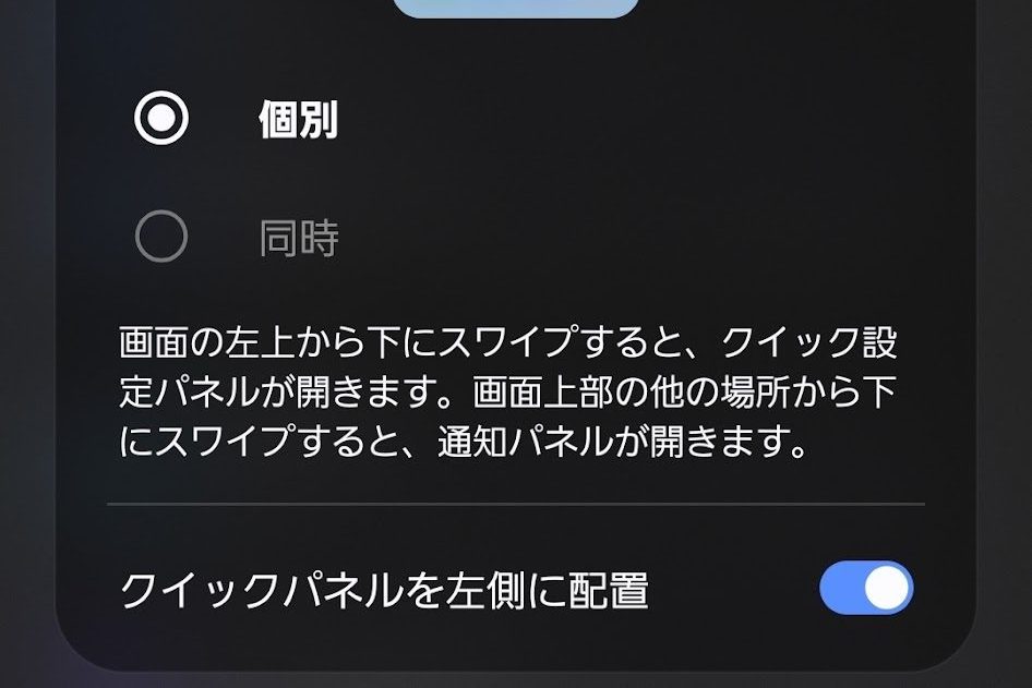 例えば、通知を開くには画面左での下スワイプ、クイックパネルは画面右での下スワイプになっています。One UIではこれを逆に変更可能なうえ、左右関係なく通知とクイックパネルが同時に表示される設定もあります。
